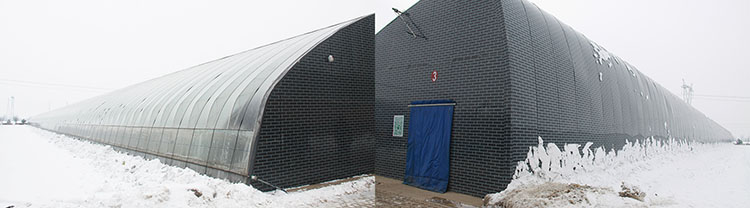 冬季晴天外界-30℃下,室內(nèi)溫度在8℃以上,冬季正常天氣條件下可不加溫進(jìn)行果菜類作物生產(chǎn)。