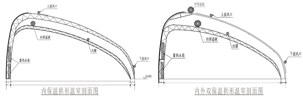 新型水蓄熱內(nèi)(雙)保溫裝配式拱形溫室具有以下特點: